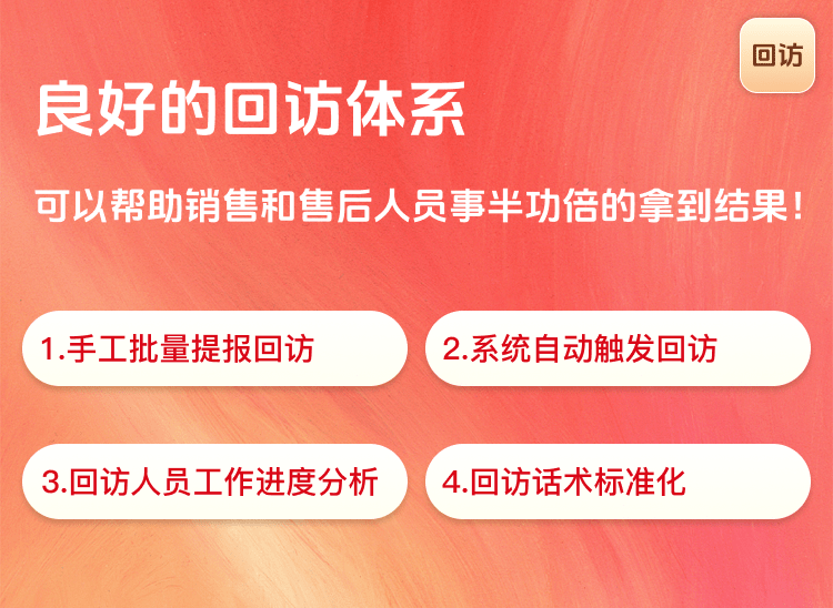 良好的回访体系,可以帮助销售和售后人员事半功倍的拿到结果。
