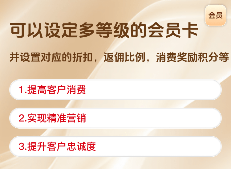 可以设定多等级的会员卡,并设置对应的折扣,返佣比例,消费奖励积分等