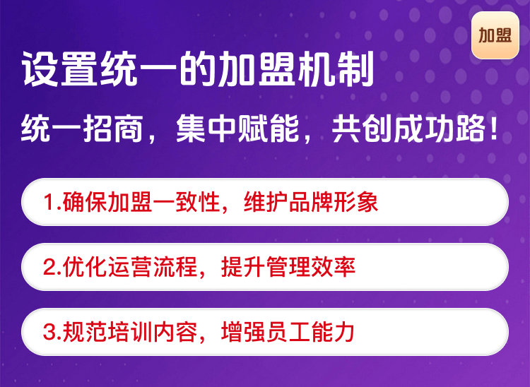 设置统一的加盟机制,统一招商,集中赋能,共创成功路!