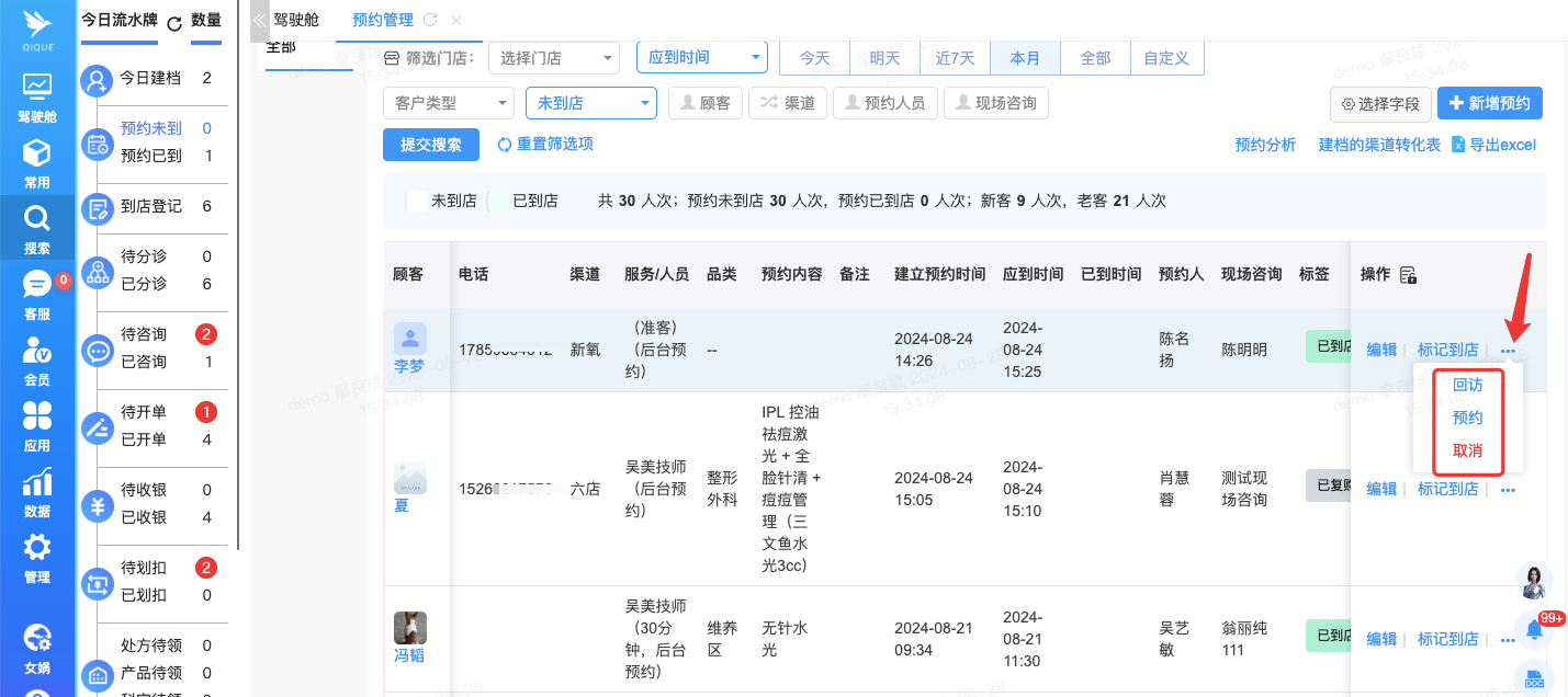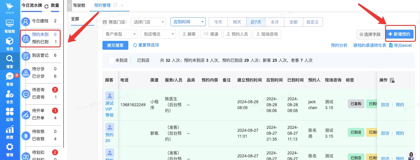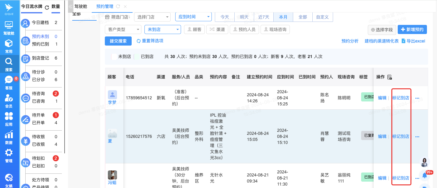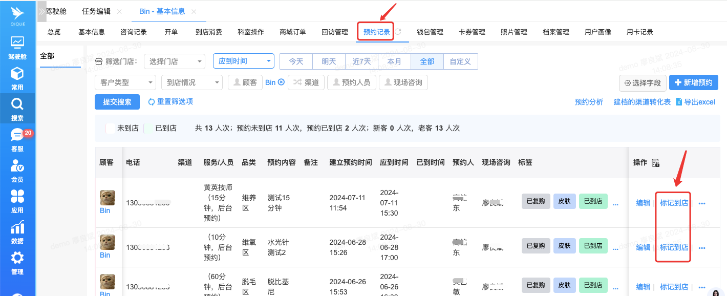 1、有开通店务系统的门店:今日预约的顾客,到门店前台登记到店后会自动标记顾客已到店;