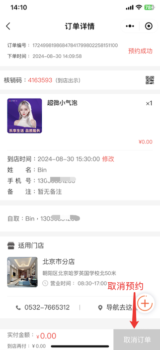 是顾客自助预约,可以让顾客在小程序的会员中心的预约订单进行取消预约订单;
