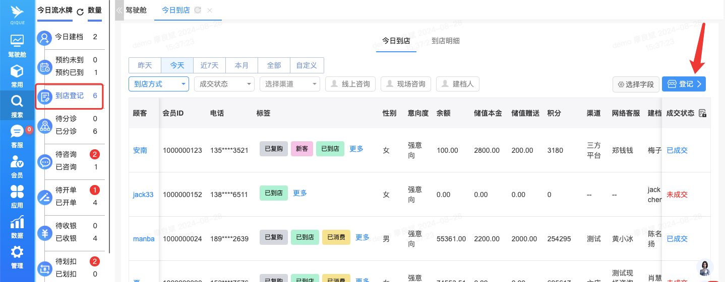 1通过电脑、或平板的谷歌浏览器登录企雀系统后台-今日流水牌-“到店登记”;