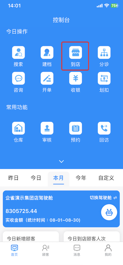 2通过手机下载“企雀助手”APP-上面今天操作里有“到店”菜单;