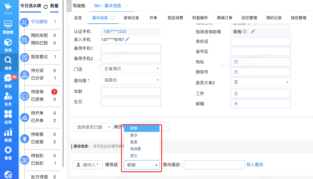 6.其它:当顾客为本店员工时,到店消费选择的接诊状态为其它。