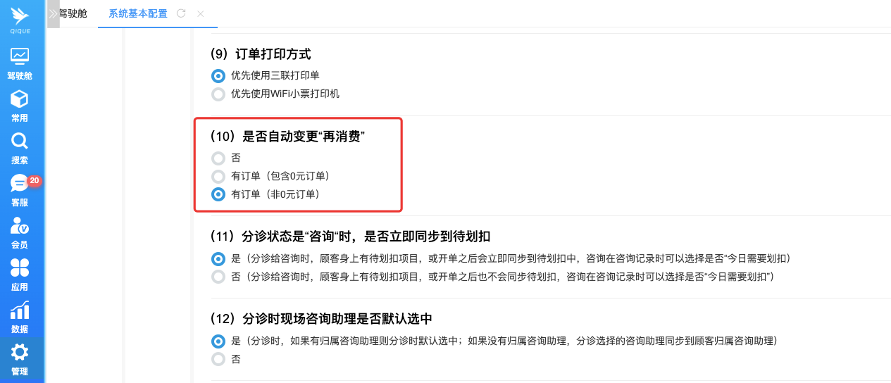 注解:前台在顾客到店分诊时选择的是“复查”或“疗程中”,在这期间有产生新订单则自动变更为“再消费”)。