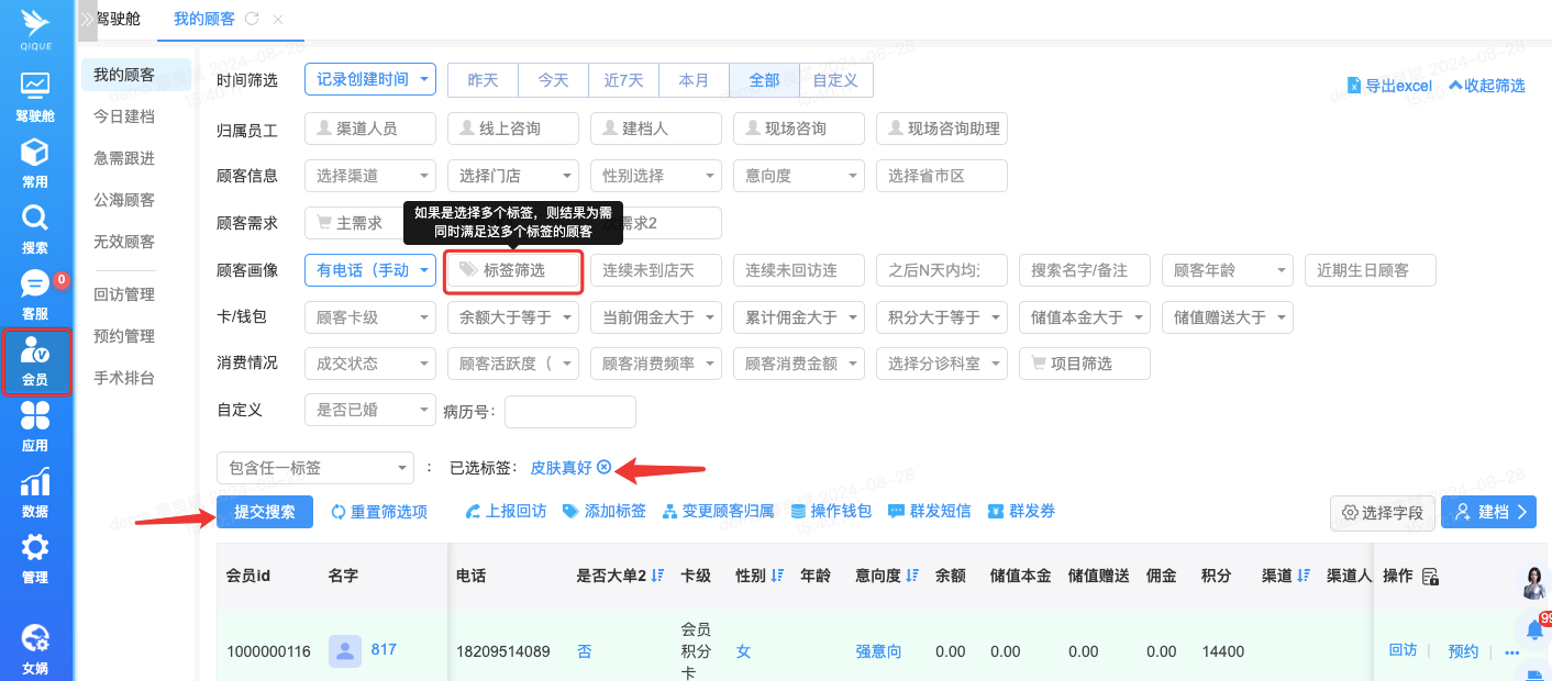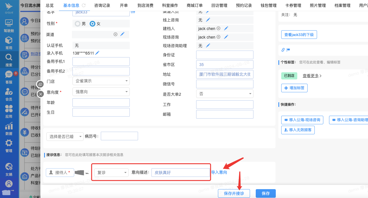 顾客到店后,由前台导医接待并进行登记。在登记过程中,可以记录顾客的意向项目,并将这些意向信息导入系统。后续,可以通过会员管理系统筛选意向标签,实现对顾客的精细化管理。这种方法有助于根据顾客的需求进行精准跟进,提升服务质量和客户满意度。