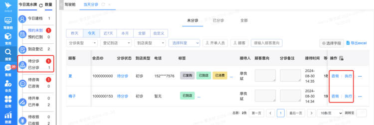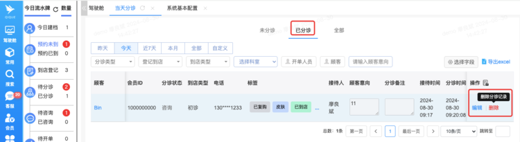 2、分诊错误后或者分诊后现场咨询师在忙,可以重新修改给其他的现场咨询师来接待。可以从流水牌“已分诊”页面点击编辑或者删除分诊操作
