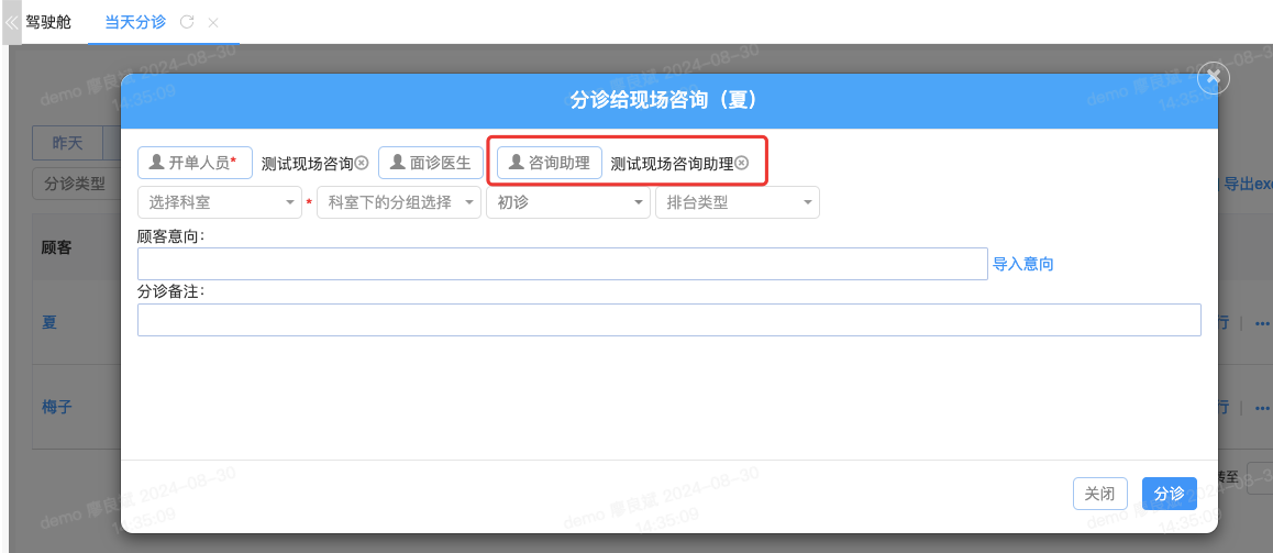 一些门店设有专门的咨询助理岗位,负责客户的接待和引导工作。每位客户都有专属的咨询助理,他们在前台分诊后,将客户引领至咨询室与现场咨询师进行面诊。期间,咨询助理会向客户介绍门店的企业文化和创始人信息,以增强客户对门店的信任感。由于咨询助理的接待客户数量与其业绩挂钩,因此在分诊时默认选择此岗位。