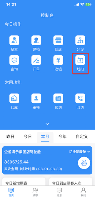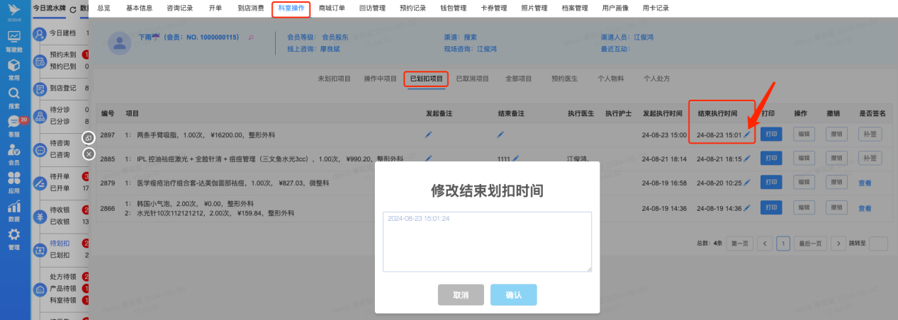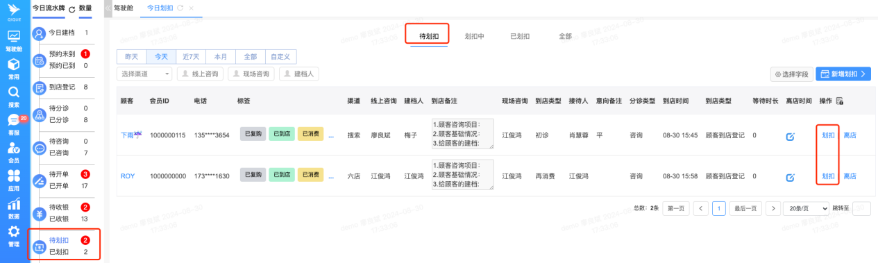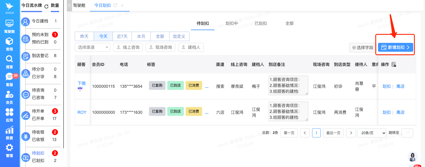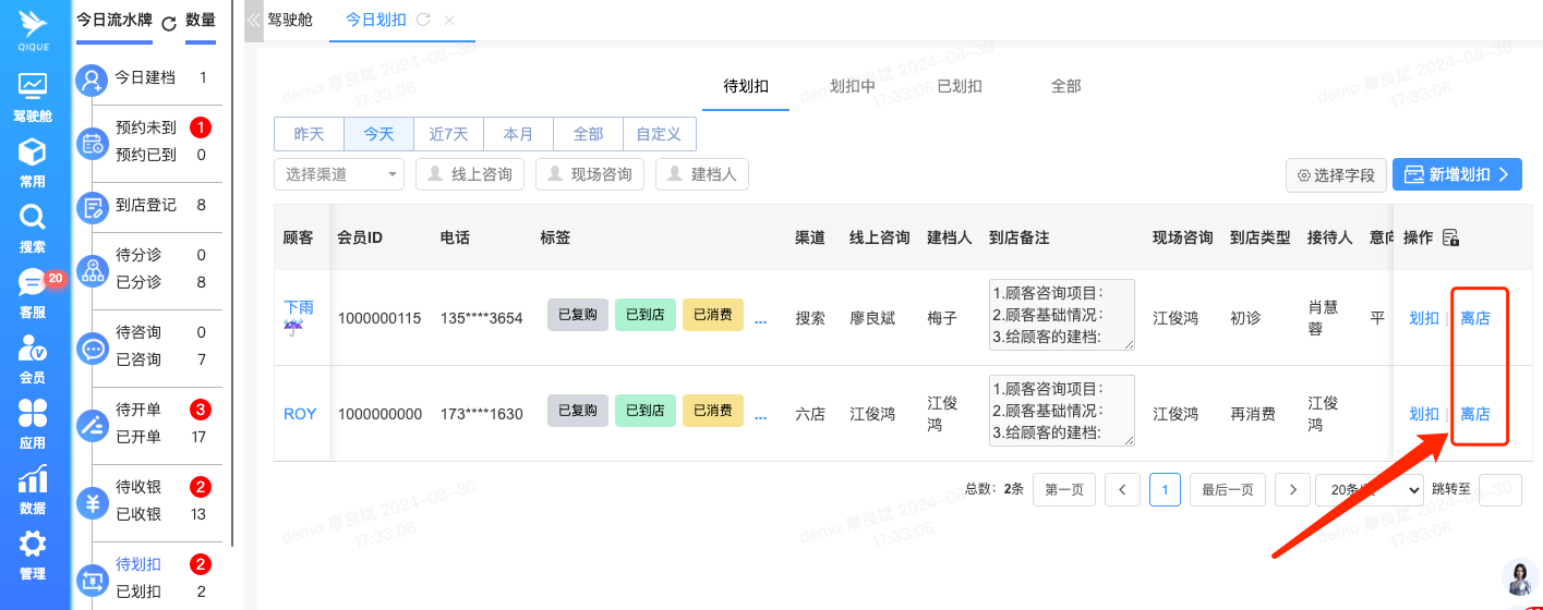 当顾客完成项目且没有其他待做项目或咨询需求时,即将离店的顾客可以在划扣记录信息中点击“离店”操作。此操作将使该顾客从今日流水牌中的待开单、待上传、待写病历等列表中移除,从而让员工更清晰地查看今日待处理的任务。