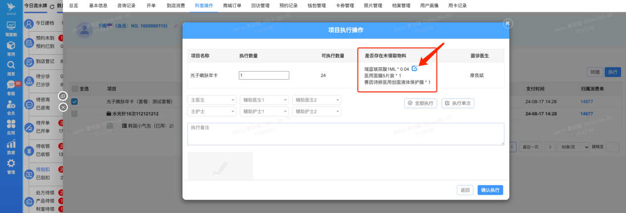服务人员在发起项目的执行划扣时,可以根据顾客实际需要的耗材进行选择。尽管有些项目绑定了固定耗材,但在为顾客做项目时,如有物料需求的变动,可以通过划扣操作增减对应的耗材。