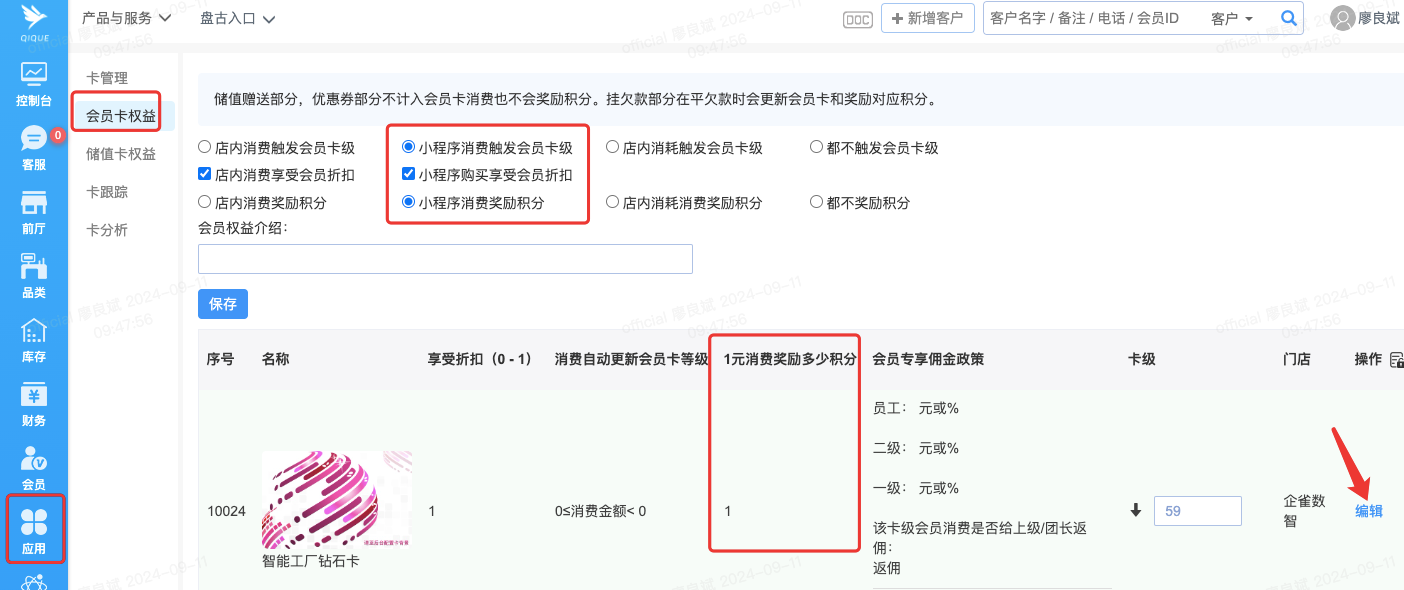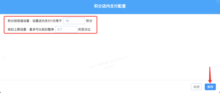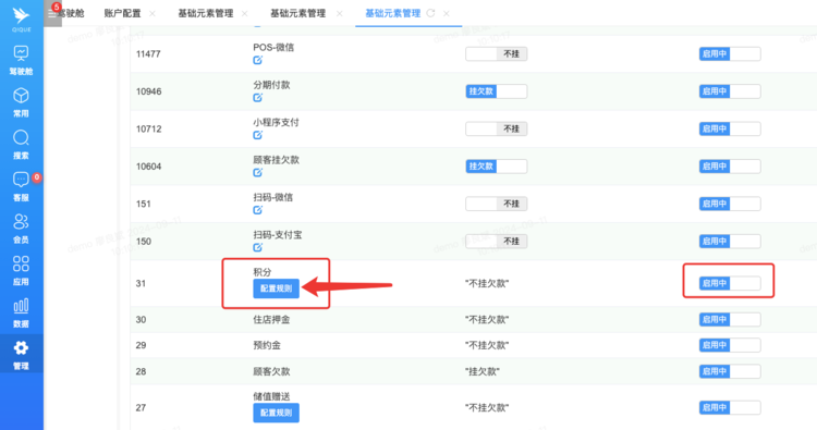 在基础元素页面启用积分并配置积分应用的规则,可以设置店内消费xx元抵扣多少积分,及积分抵扣的上限。