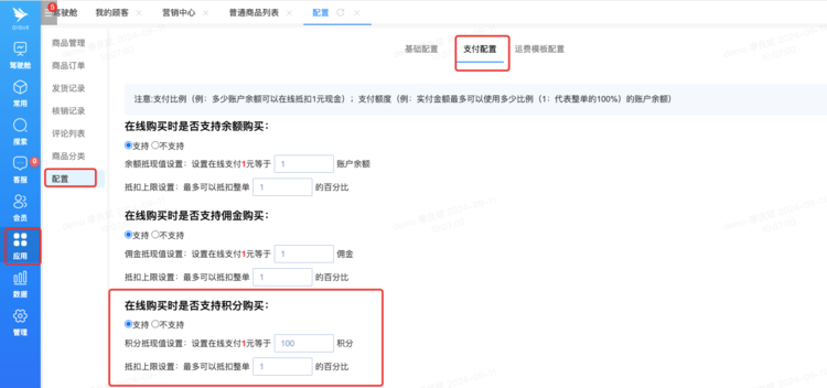 线上商品购买使用积分的设置,应用商城--支付配置页面,可以设置商城是否支持使用积分购买的行为,并设置积分抵扣的比列及上限。