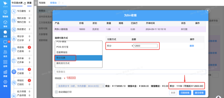 店内开单后,收银页面,可以选择支付方式“积分兑换”,同时在收银页面有提示顾客当前剩余积分,及通过积分最多可抵扣的金额是多少,积分不足的情况就需要选择其他方式组合收银来补足余额。