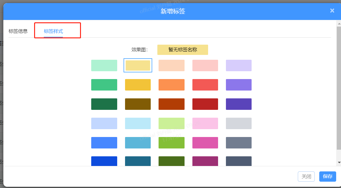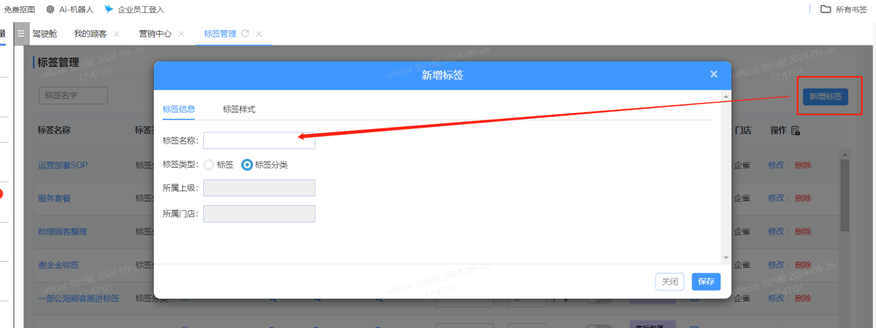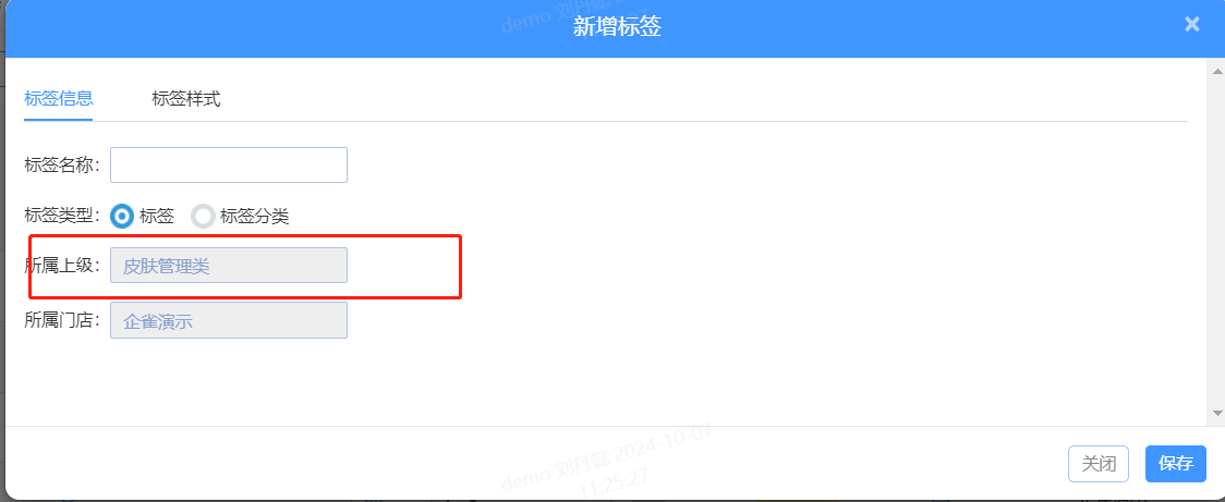 点击右上角先创建一个标签分类,所属上级和所属门店都是默认,无需编辑。每个标签分类都可以进行不同颜色的设置。
