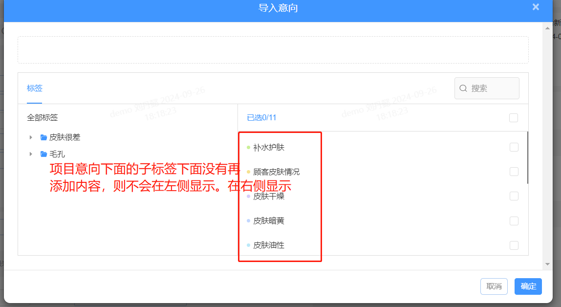 如果子标签下面没有下级标签,那么在导入意向这里,子标签就不会显示在左侧。而且直接显示在标签右侧