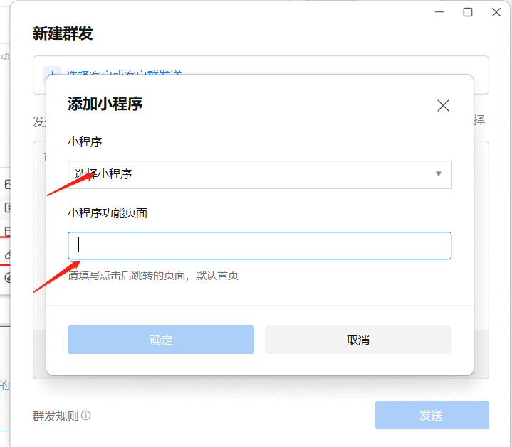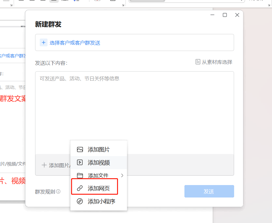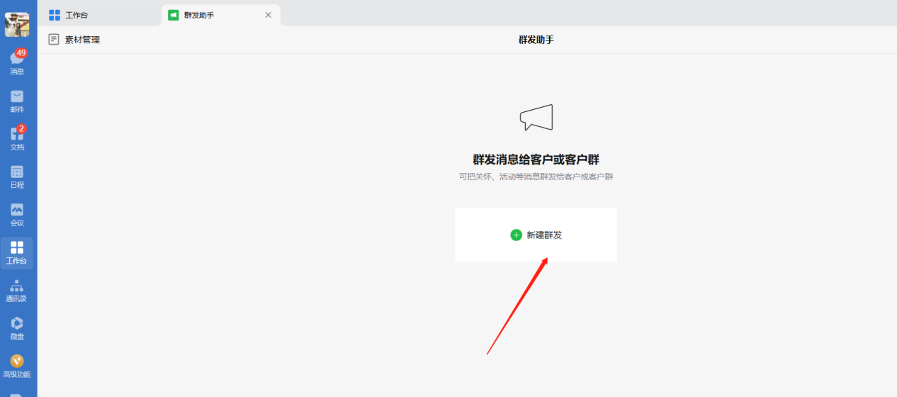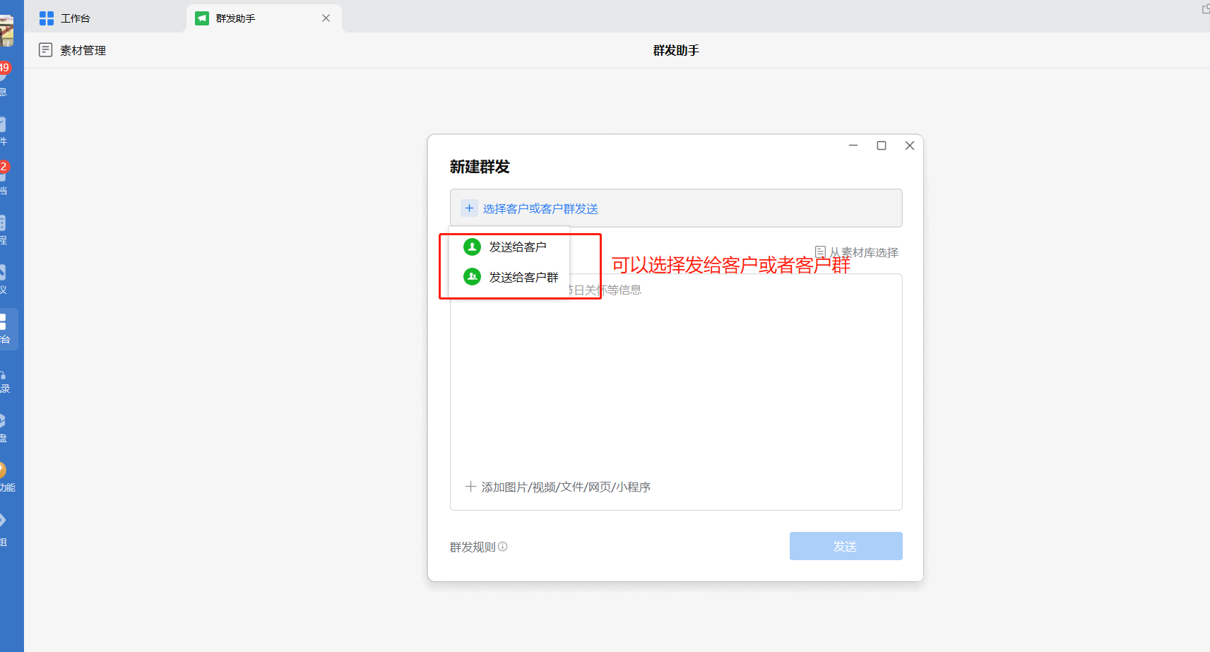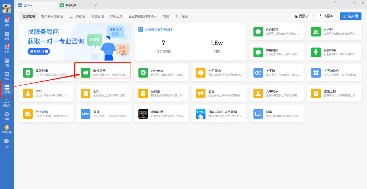 电脑端操作步骤左侧“工作台“-群发助手群发插入网页和小程序操作步骤: