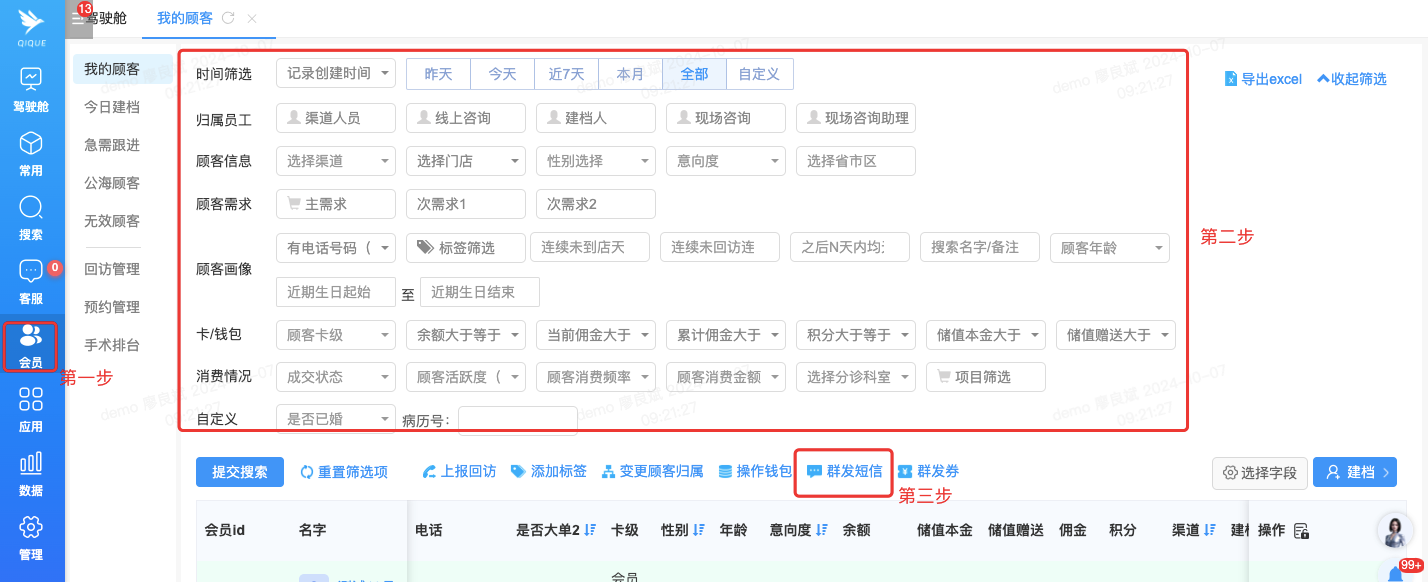 系统操作路径:会员--筛选客户群体--群发短信
