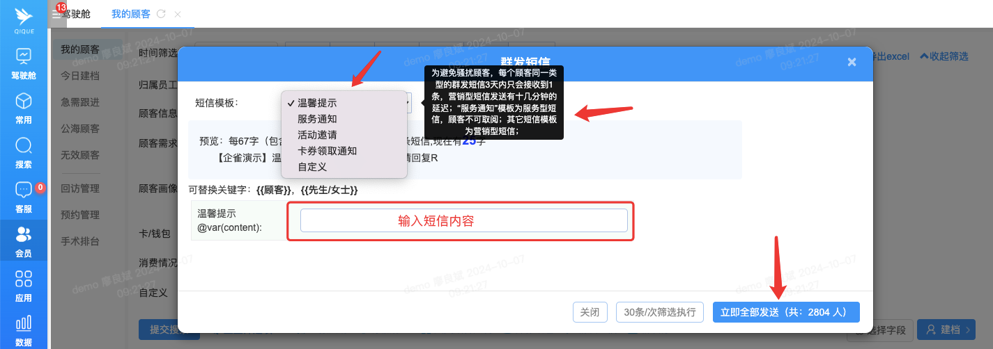 注意:一个顾客当天只能群发触达一次,包括短信,优惠券等群发方式。