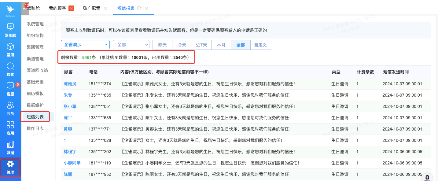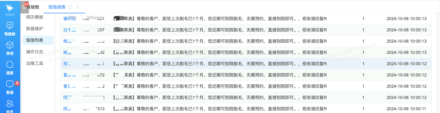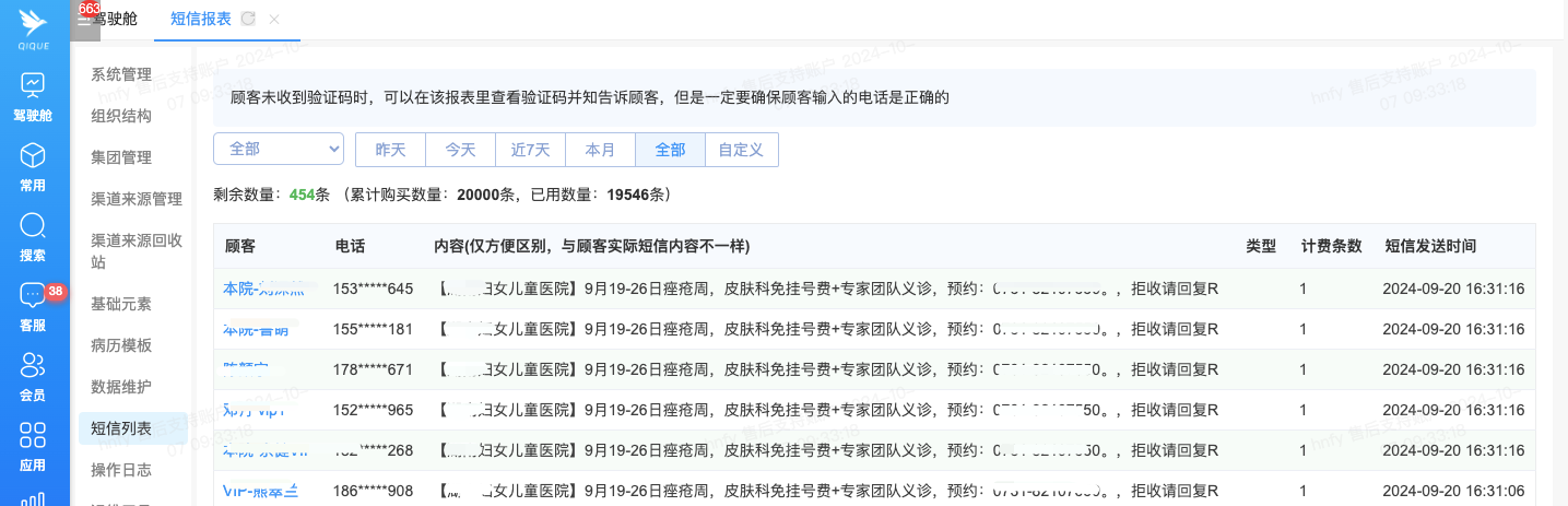 短信发送记录,使用数量及剩余数量可在列表查看,短信数量不足时需联系售后客服进行充值,收费0.08元/条