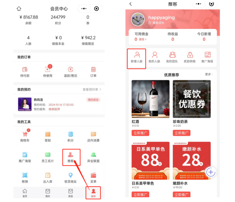 报备操作路径:进入小程序会员中心--推客--新增人脉