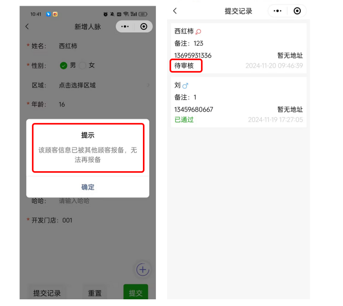 如果填写的信息是店家已有的顾客,则会提示无法再报备;