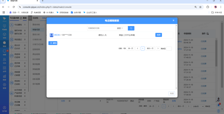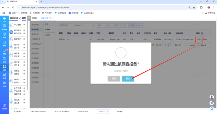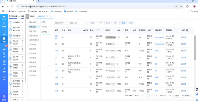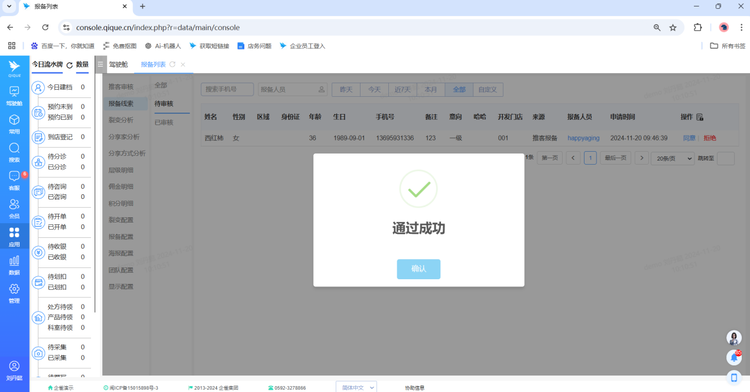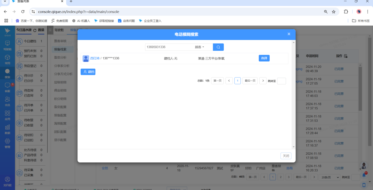 审核通过的顾客会在“已审核”页面,绑定层级关系的同时,系统也能搜索到报备顾客的个人档案信息