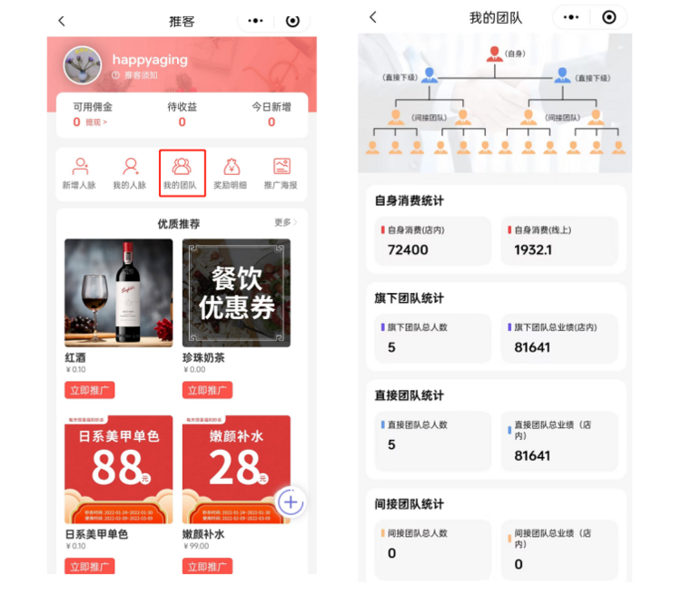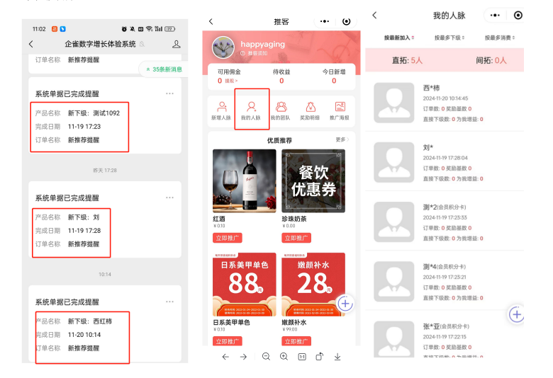 报备成功后,合伙人会在公众号收到绑定下级的通知,也能在“推客”页面查看自己的人脉/团队,以及后续下级/团队消费的明细及佣金提现操作