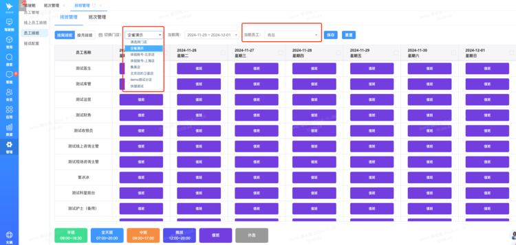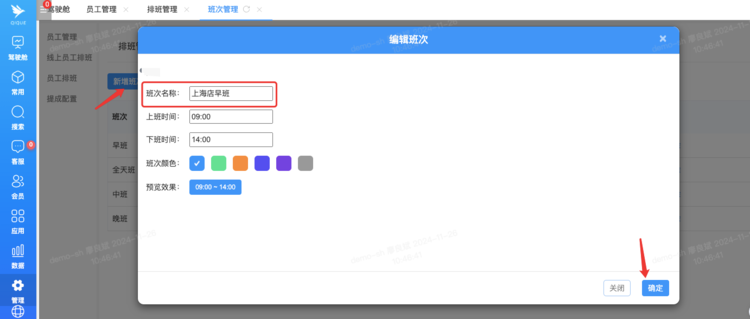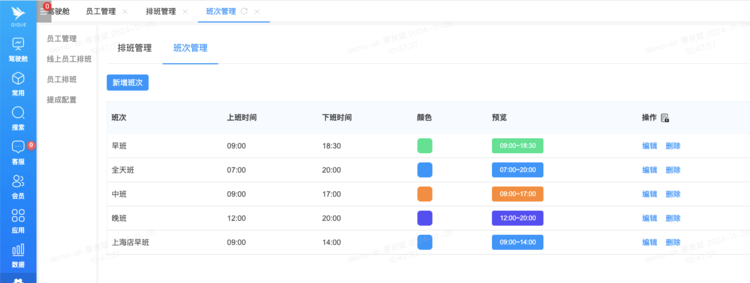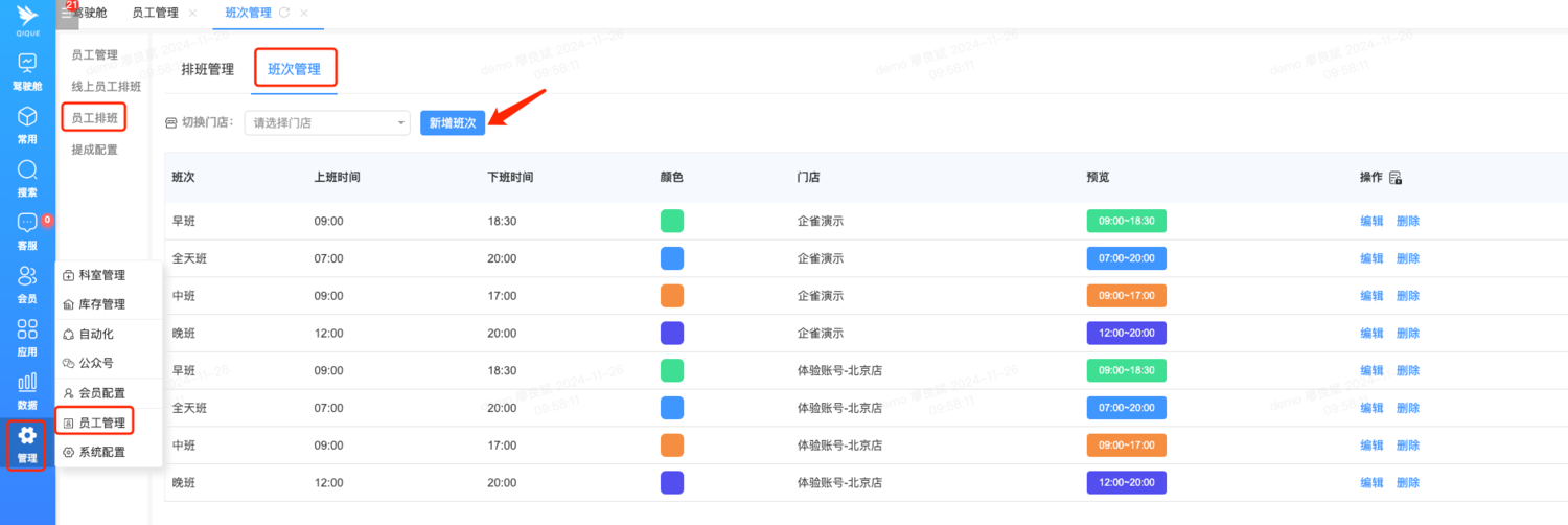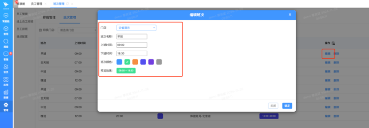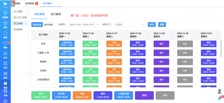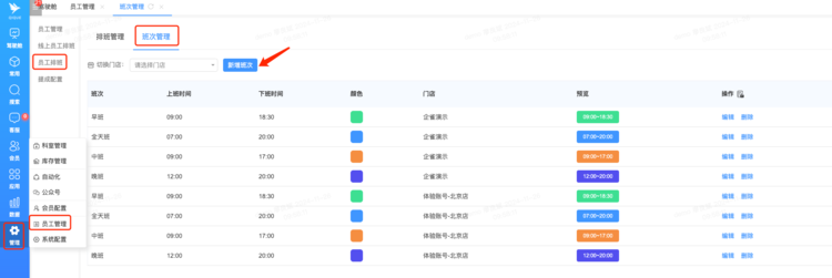集团后台可以查看或编辑各分店的班次,分店仅管理自己门店的排班