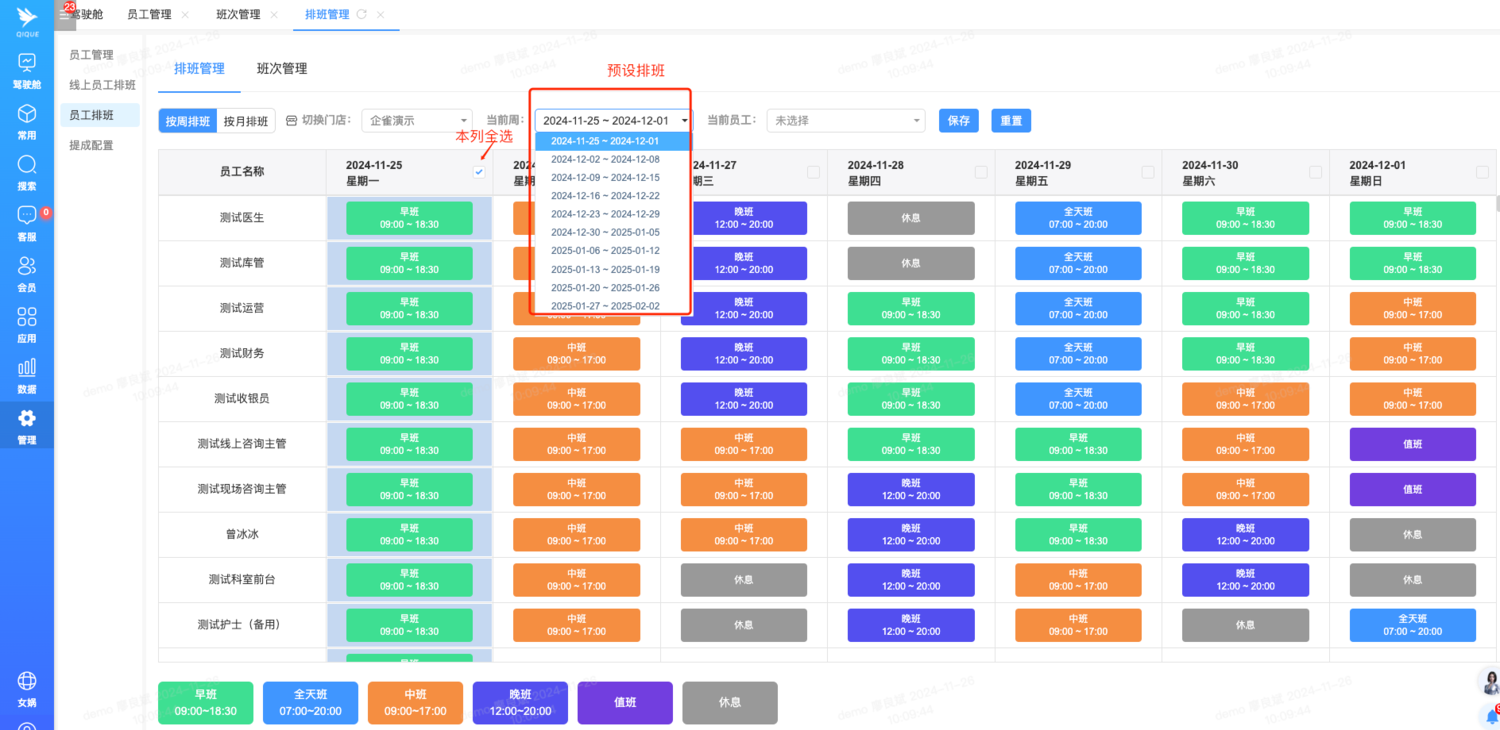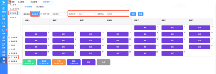 按月排班需要先选择员工,在进行班次排列,点击“保存”即可生效;次月排班支持预设。