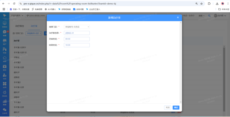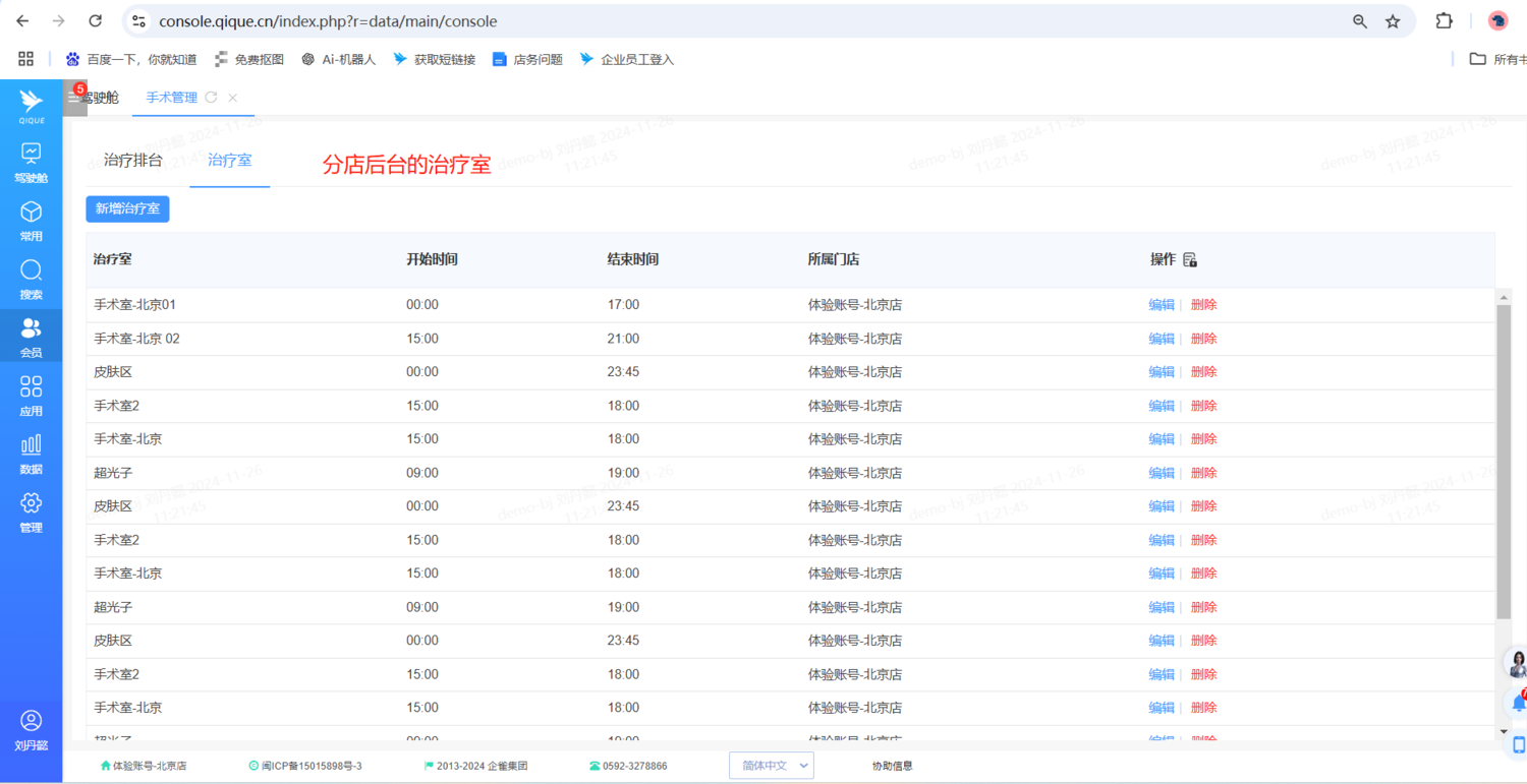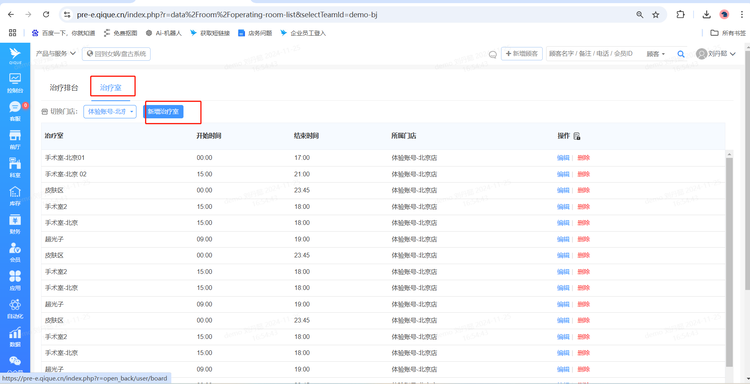 1、集团后台可以查看并编辑各分店的治疗室,分店后台仅查看编辑自己门店的治疗室。