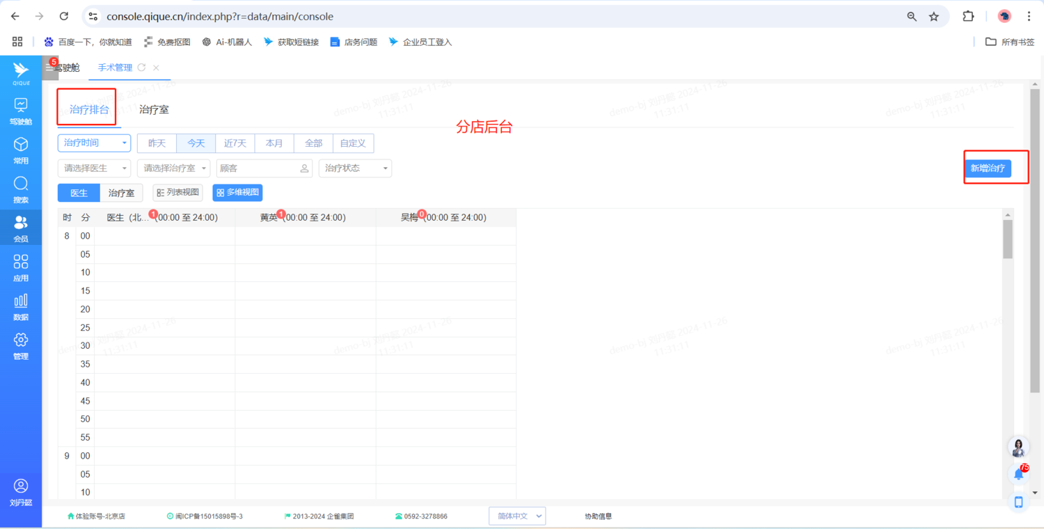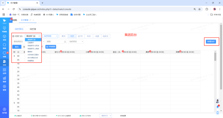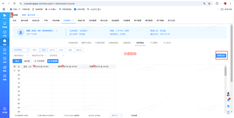 1、集团后台可以查看各分店的治疗室预约情况,也可以直接给顾客预约某个分店的治疗室。分店后台仅查看预约自己门店的治疗室。
