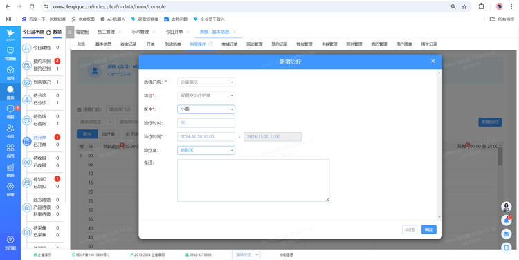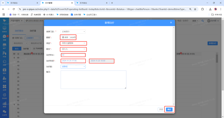 2、点击新增治疗给客户预约治疗室,填写要预约治疗室的客户、要做的项目、执行的人员、以及治疗时长和对应的预约时间还有治疗室。
