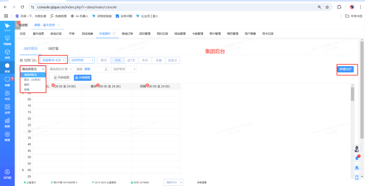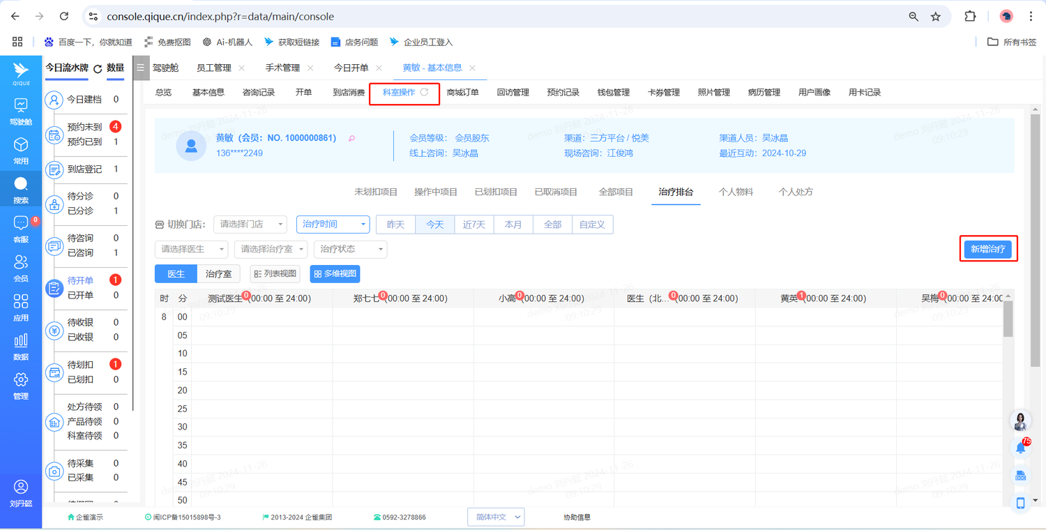 1、打开顾客的个人信息页面——科室操作——治疗排台——新增治疗
