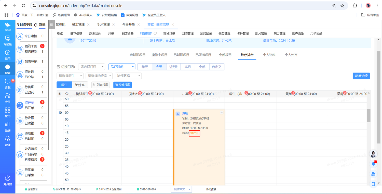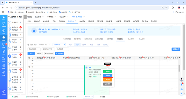 治疗排台对应顾客的状态则会自动更新为“执行中”