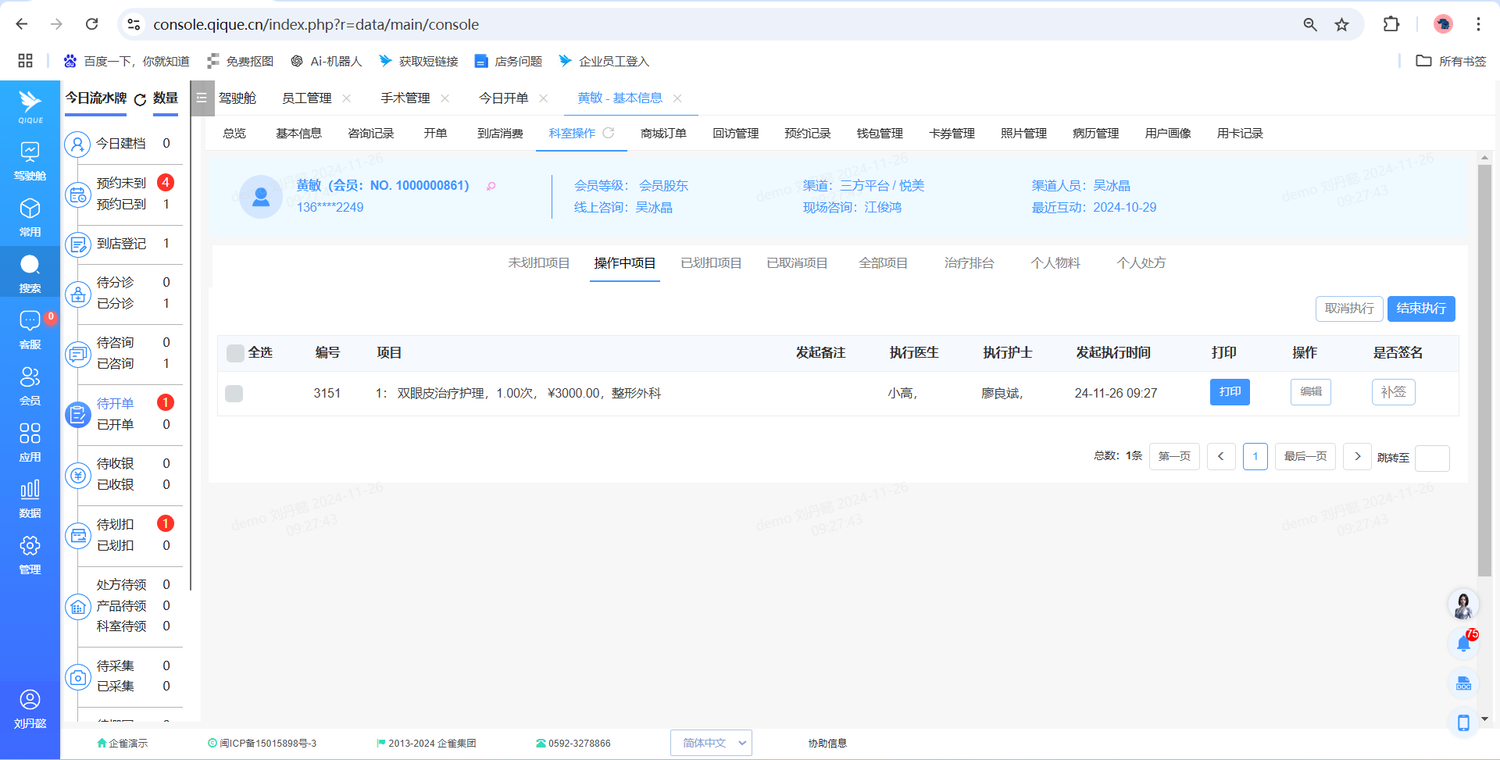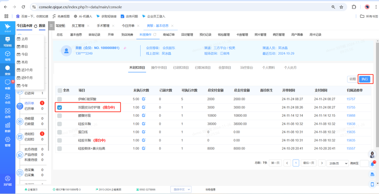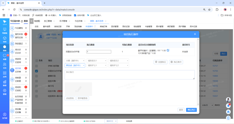 (3)执行中:轮到顾客做项目时,在未划扣项目这里会出现排台中的提示。选择项目进行执行,项目状态会变更为“操作中”