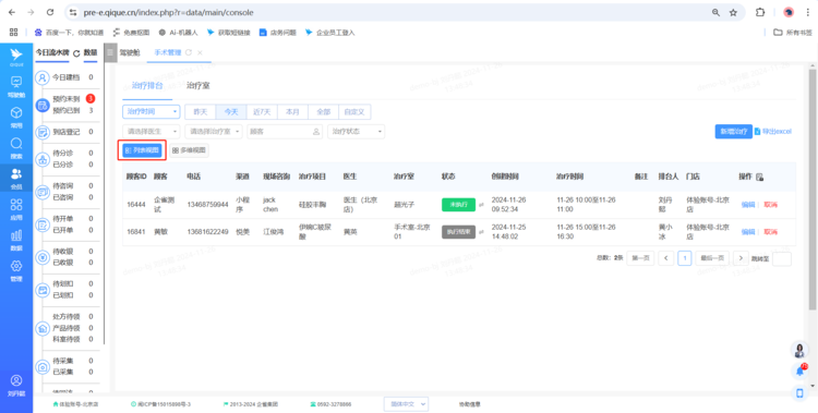 点击治疗室作为筛选项,查看每个治疗室的排台情况。有列表视图和多维视图两种展示方式。