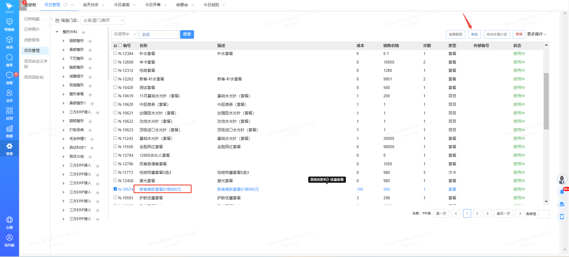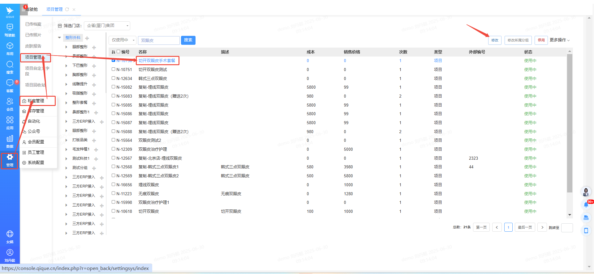 三、操作路径(管理-科室管理-找到需要做赠送配置的项目-选中进行修改-赠送配置)