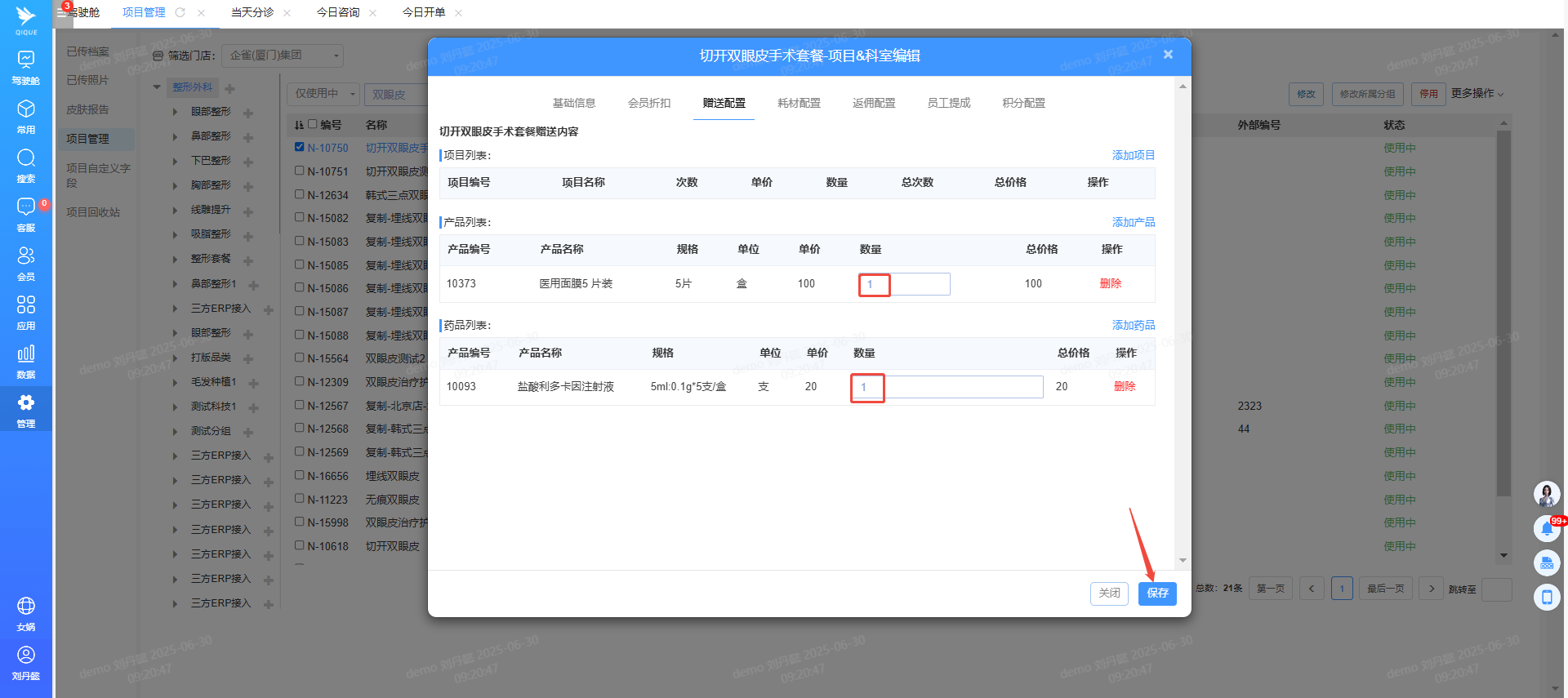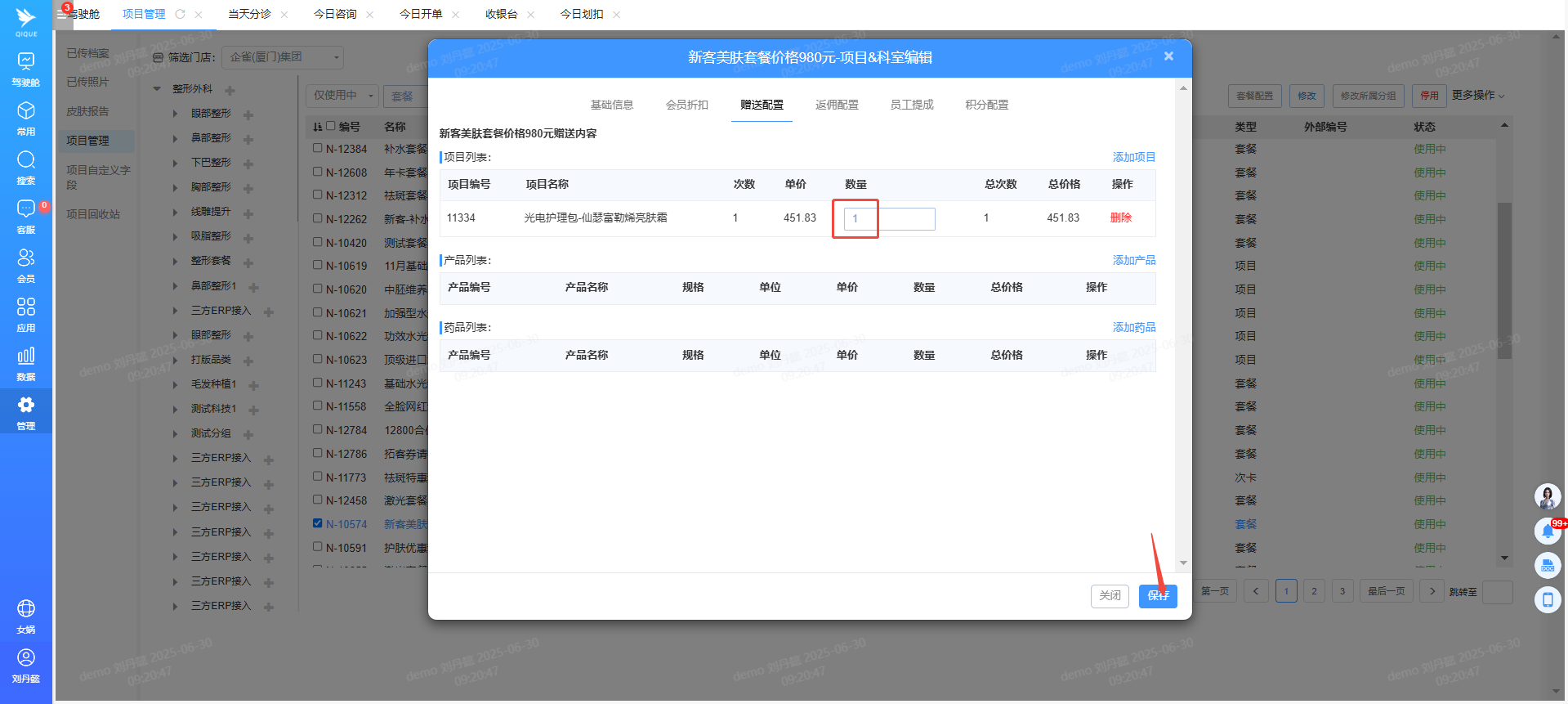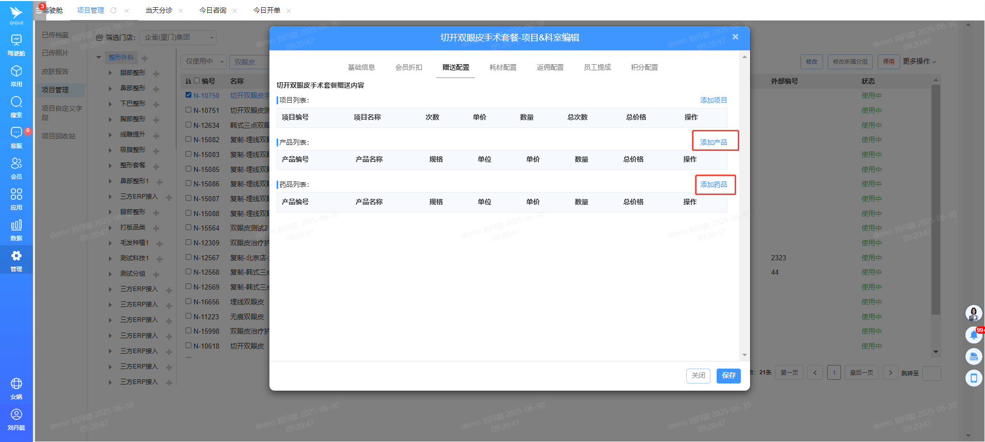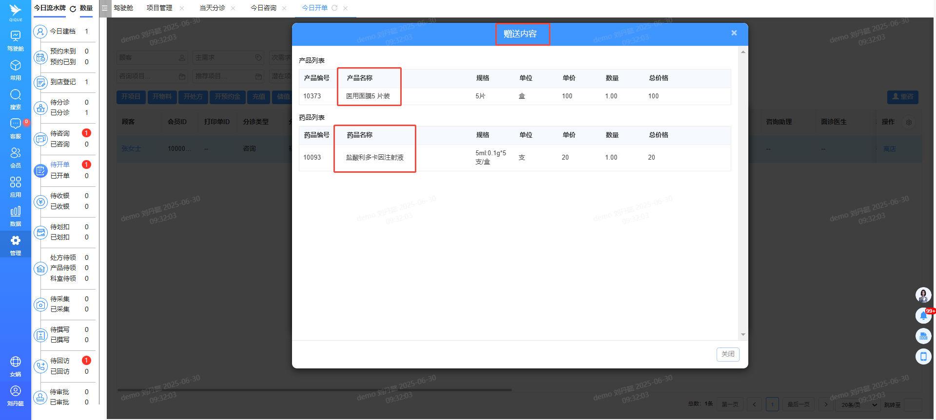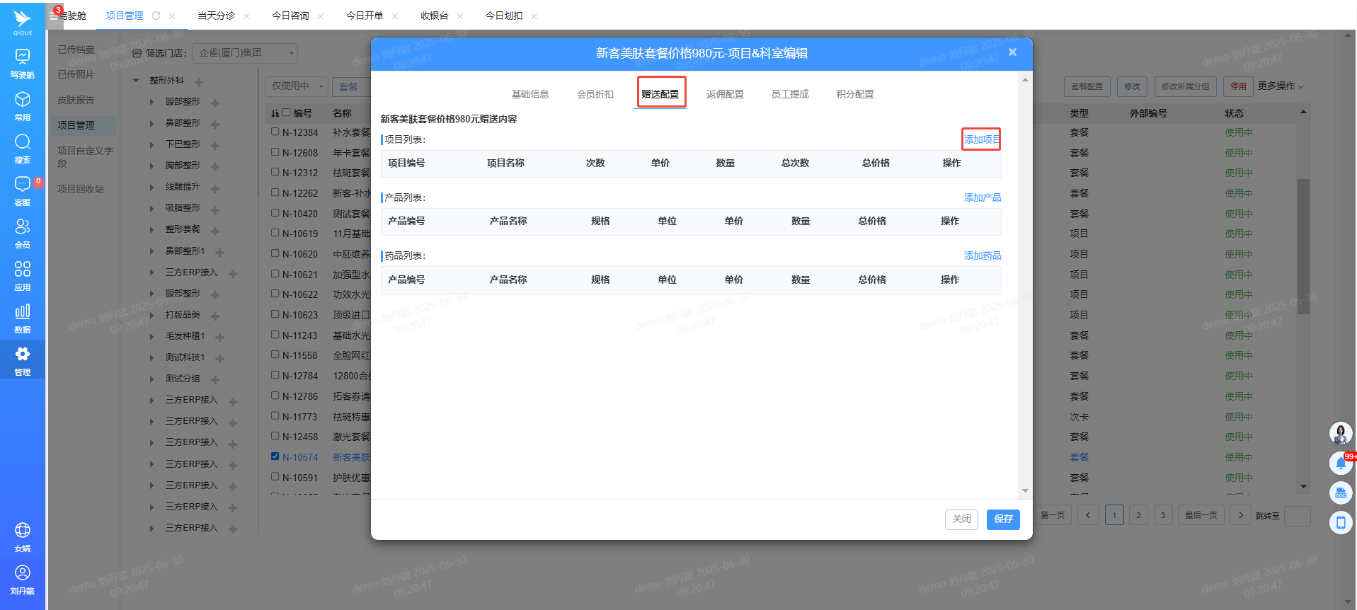 系统支持品类项目配置赠送项目、产品、药品,配置后自动同步开单信息,简化操作流程,帮助机构在获客成本高的行业环境中,以赠品策略为支点,实现“转化率——客单价——复购率”的三维增长,同时通过系统化管理降低人为失误与合规风险。,助力商家通过赠品策略提升客单价与转化率。