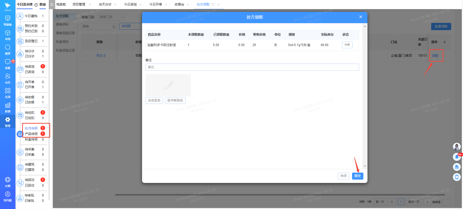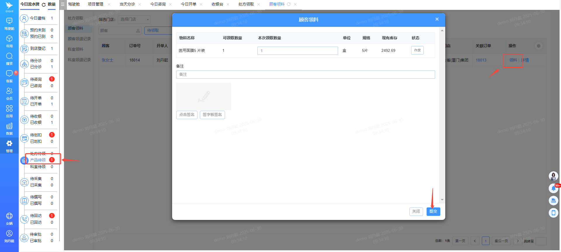 收银完成之后赠品的物料会同步到科室领料页面。可以查看需领取内容并领取。