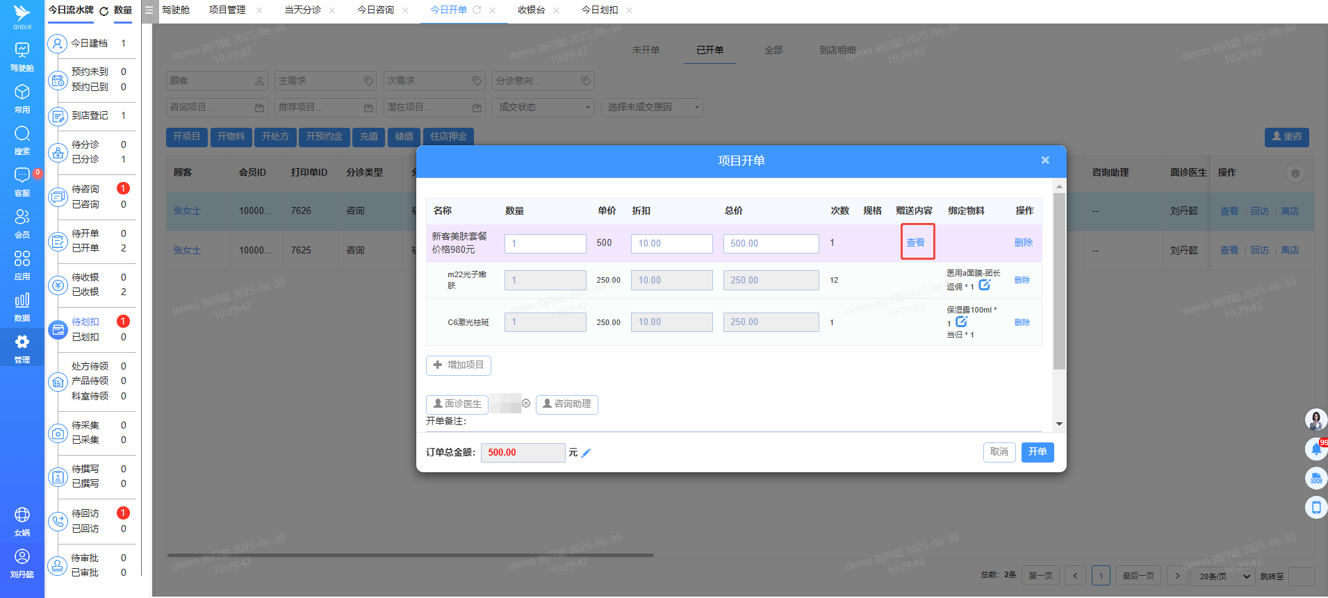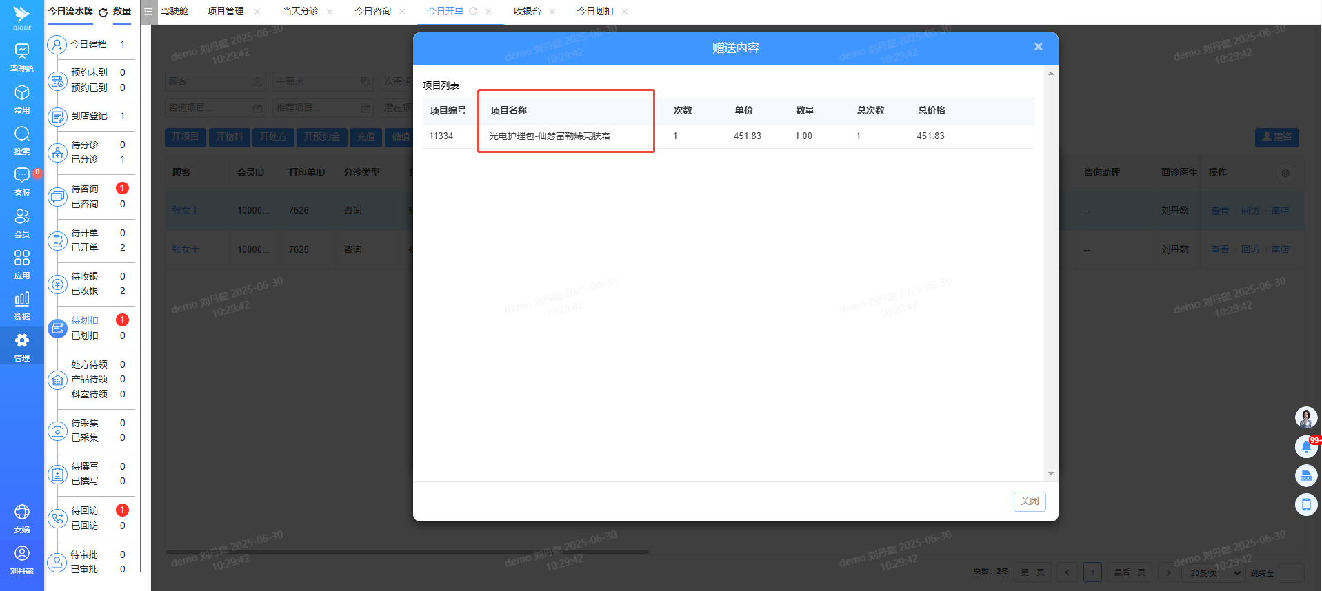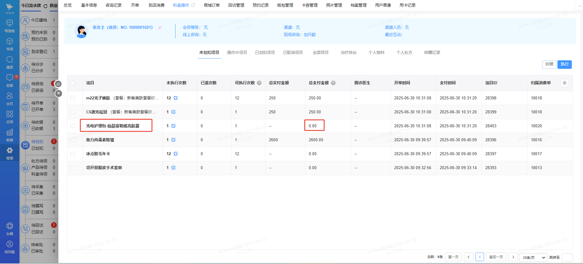 收完银之后可以直接在客户的未划扣项目看到赠送的订单,实付金额会显示为“0”